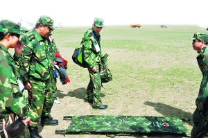 “神七”醫(yī)療救護隊在主著陸場附近集結進行有針對性的救護演練。
