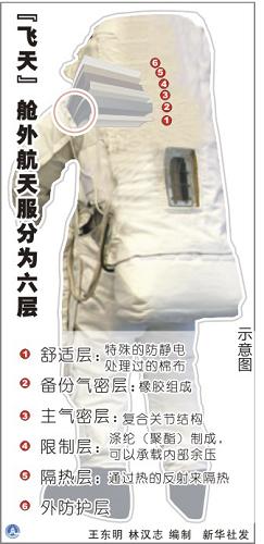 航天服的左臂上印著鮮紅的國旗,右臂上有兩個大字:“飛天”。航天服研究室主任劉向陽說,“飛天”是中國研制的第一代艙外航天服,整體設(shè)計和各部件的設(shè)計、組裝都是中國人自己完成的。就完成目前任務(wù)的能力而言,接近國際水平。