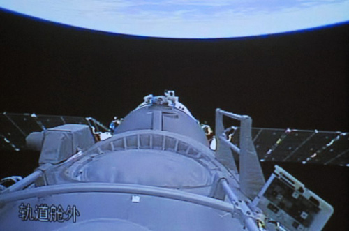 圖為26日晚北京飛控中心指揮大廳顯示屏上神舟七號(hào)艙外的畫(huà)面。