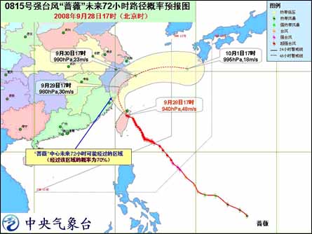 今年第15號(hào)超強(qiáng)臺(tái)風(fēng)“薔薇”的中心已于今天下午3時(shí)40分在我國(guó)臺(tái)灣省宜蘭縣南澳附近沿海登陸,登陸時(shí)中心附近最大風(fēng)力有16級(jí)(51米/秒),下午5時(shí)“薔薇”減弱為強(qiáng)臺(tái)風(fēng),其中心位于臺(tái)灣省宜蘭縣境內(nèi),就是北緯24.5度,東經(jīng)121.5度,中心附近最大風(fēng)力有15級(jí)(48米/秒)。