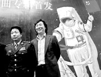 發(fā)布會(huì)上首次公布了隨“神七”飛船飛天的100多首歌曲,其中包括全新創(chuàng)作的15首航天歌曲專(zhuān)輯。楊利偉表示,“我深?lèi)?ài)《我為祖國(guó)感到驕傲》這首歌,每一次聽(tīng)到都會(huì)感到心情激動(dòng)。那就是我們航天員回到地球打開(kāi)艙門(mén)時(shí)最想說(shuō)的第一句話(huà),是我們的真情感受!北九_(tái)晚會(huì)的音樂(lè)總監(jiān)、蒙族音樂(lè)家恩克巴雅爾也是 《我為祖國(guó)感到驕傲》的曲作者,他介紹說(shuō):“這一百多首歌曲有郭蘭英演唱的《我的祖國(guó)》、宋祖英演唱的《望月》以及成龍演唱的《男兒當(dāng)自強(qiáng)》等。”(記者 李澄/文 鄒紅/攝)