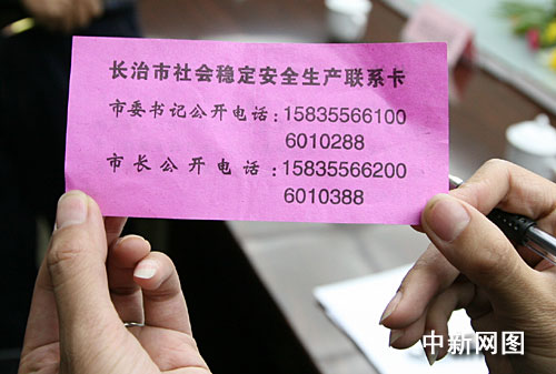 中新網(wǎng)長(zhǎng)治10月21日電(記者 唐偉杰 任麗娜)9月底,山西長(zhǎng)治市共印制了96萬(wàn)張印有市委書記和市長(zhǎng)電話的“名片”。這些“名片”日前陸續(xù)發(fā)放到全市1萬(wàn)名公安干警、5萬(wàn)名煤礦工人、10萬(wàn)市民家庭、80萬(wàn)農(nóng)民家庭。長(zhǎng)治市民可直接撥打“名片”上的電話反映問(wèn)題。