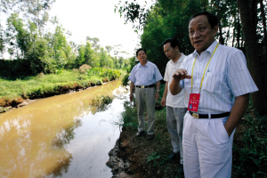 三位暗訪的省人大代表在排放口仔細(xì)觀察。“這里肯定存在偷排污水現(xiàn)象,否則怎么會(huì)淤積這么厚的黑泥?”省人大環(huán)資委副主任委員潘大林說。他還指給記者看,排放口上游河岸兩邊是黃泥,到下游就變成黑色,水面也開始漂浮油污。