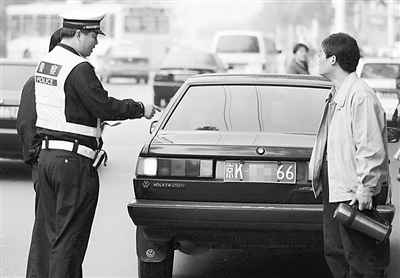 北京交警對違反“五日制”限行規(guī)定者進(jìn)行處罰。