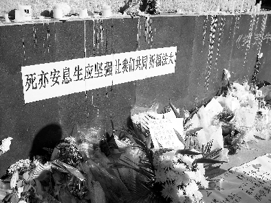 “死亦安息生應(yīng)堅強讓我們共同祈福法大”。10月31日中午,中國政法大學(xué)昌平校區(qū)拓荒牛雕塑的基座上,一條白底黑字的條幅在陽光下冷冷地注視著過往的每一個人。雕塑前的地面上,幾排黃色的、白色的菊花在秋風(fēng)中靜靜綻放。