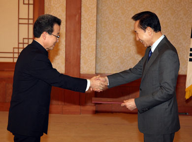 隨后程大使到接見廳向李明博總統(tǒng)遞交國書。韓外交部長官柳明桓、總統(tǒng)外交安保首席秘書金星煥和中國駐韓國大使館公參邢海明、陳洲等參加了儀式。