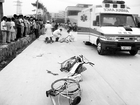 而此時,駱某正駕駛著泥頭車(當(dāng)?shù)乩恋囊环N貨車)經(jīng)城東歧江路開往城東中學(xué),在歧江路的拐彎處撞倒了3名學(xué)生和1名群眾。正在城東中學(xué)北門(后門)值班的綜治員黃積強(qiáng)和張耀毫發(fā)現(xiàn)后,一人邊大喊讓剛放學(xué)的學(xué)生們躲避,邊用對講機(jī)向白蕉鎮(zhèn)派出所報告,另一人則追趕泥頭車喝令其停下。
