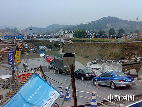 據(jù)了解,塌陷面積20米寬100米長,深10米,14輛車陷在其中。因事故影響,現(xiàn)場周邊已經(jīng)斷電,杭州市蕭山區(qū)第一世界大酒店一個大型會議正臨時轉(zhuǎn)移會場。截至到17:20,已經(jīng)發(fā)現(xiàn)12輛車輛被埋,塌陷處已經(jīng)嚴重積水,一輛327路公交車也陷入其中,地下至少有20余名地鐵施工人員。 據(jù)救援人員介紹,在車輛上的人員基本安全,但當(dāng)時在地下還有20名左右的地鐵施工人員正在進行施工。到目前為止,救上5個施工人員,而埋在土石下面的,估計還有15名左右的施工人員。