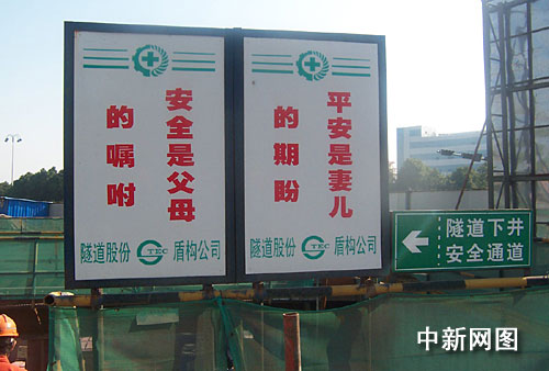 在地鐵施工現(xiàn)場,安全標(biāo)語高高樹立。 作者:汪恩民