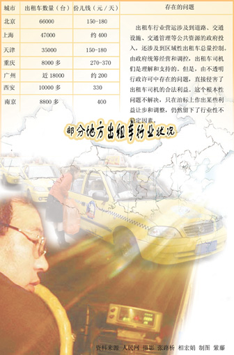 據(jù)記者了解,目前各地政府對出租車的投放模式有兩類:一是政府通過行政審批的方式控制出租車的總量;一是政府一次性拍賣出租車經營權。第一種模式導致了出租車公司的中間盤剝,也就是出租車司機說的“份兒錢”;第二種模式產生的問題是,政府一次性拍賣了出租車經營權,斬斷中間盤剝鏈條,取消“份兒錢”,但是導致“出租車經營權”的猖獗倒賣,比如,一些地方就出現(xiàn)了原來10萬元從政府處買來,卻60萬賣給其他人經營的事情。