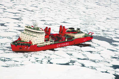 資料圖片:從直升機(jī)上拍攝到的浮冰中的雪龍船。余建斌 攝