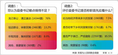 記者:來這里之前,我們和人民網(wǎng)做過一個調(diào)查,有76%的網(wǎng)友認(rèn)為,現(xiàn)在的縣委書記在“克己奉公,清正廉潔”這方面做得不足。請各位談?wù)劵鶎印耙话咽帧钡谋O(jiān)督現(xiàn)狀?