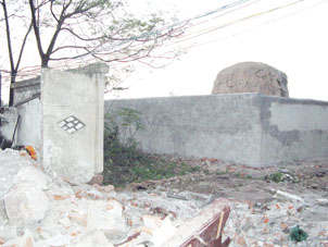 記者趕到鄂州那天,已是日暮時(shí)分。在當(dāng)?shù)鼐用竦闹敢,記者才找到摩崖石刻。只?jiàn)一塊褐色的石頭,已被兩米高的水泥墻圍了起來(lái)。鏡頭稍微拉開一點(diǎn),這個(gè)國(guó)家重點(diǎn)保護(hù)文物四周,便是拆遷后的殘?jiān)珨啾,廢棄的磚頭、鋼筋、破布散落一地。冬日夕陽(yáng)的斜照下,一片蕭索。