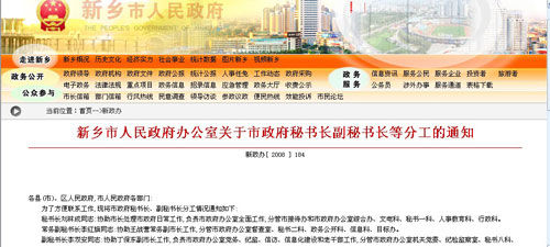 記者隨后登陸新鄉(xiāng)市人民政府門戶網(wǎng)站,在市政府文件一欄,發(fā)現(xiàn)了該市2008年10月通過的《新鄉(xiāng)市人民政府關(guān)于市長(zhǎng)副市長(zhǎng)市長(zhǎng)助理等分工的通知》和《新鄉(xiāng)市人民政府辦公室關(guān)于市政府秘書長(zhǎng)副秘書長(zhǎng)等分工的通知》兩個(gè)文件,文件表明,河南省新鄉(xiāng)市設(shè)有11名副市長(zhǎng);1名秘書長(zhǎng),16名副秘書長(zhǎng);此外還有6名調(diào)研員協(xié)助副市長(zhǎng)工作。 (荊楚網(wǎng))
