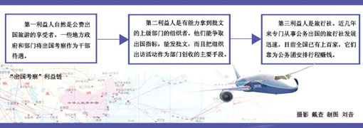 第三利益人自然就是旅行社。據(jù)了解,近幾年來專門從事公務(wù)出國的旅行社發(fā)展迅速,目前全國已有上百家,集中在廣州、上海、北京、南京、寧波等地。它們靠為公務(wù)團(tuán)安排行程賺錢!艾F(xiàn)在各級各地組織的出境、出國考察活動,絕大部分是通過旅游公司出去、并由境外旅游機構(gòu)接團(tuán)安排行程的,其實就是公款旅游!毙掠嗍形晃桓刹繉τ浾哒f。