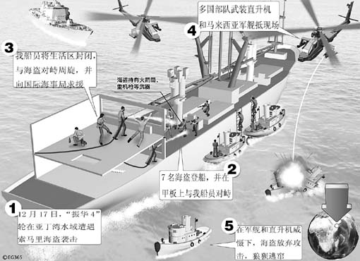 這是一片海盜經(jīng)常出沒的海域。不過,“振華4”輪還是有所準(zhǔn)備的,因為早在11月29日,交通運輸部、外交部、商務(wù)部等有關(guān)部門曾聯(lián)合召開了遠(yuǎn)洋船舶防范海盜專題會議,要求各航運企業(yè)完善防范、應(yīng)對海盜的應(yīng)急處置預(yù)案,組織演練,增強船員應(yīng)對海盜的技能。