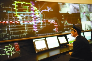 昨日,工作人員在指揮大廳監(jiān)控地鐵。本報(bào)記者 浦峰 攝