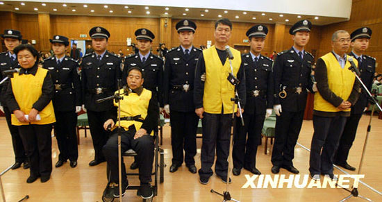 上午八時(shí),本案開(kāi)庭,能容納四百人左右的審判廳座無(wú)虛席。田文華身著印有“石市二看”字樣的黃色囚衣在兩名女法警的帶領(lǐng)下進(jìn)入法庭,神情與往常無(wú)異。同案三人均由兩名法警帶領(lǐng)進(jìn)入法庭,其中王玉良坐輪椅出庭。被訴單位三鹿集團(tuán),由工會(huì)主席冉偉光作為訴訟代表人出庭。