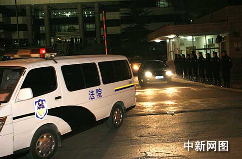 12月31日晚22時(shí)10分, 三鹿集團(tuán)及原董事長田文華等被控生產(chǎn)銷售偽劣產(chǎn)品案庭審結(jié)束。圖為押送田文華等四高管的警車駛出石家莊市中級人民法院。 作者:俱凝搏