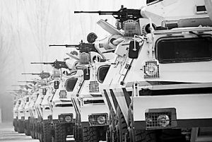 車(chē)隊(duì)啟動(dòng)了。一路上,沿途不斷傳來(lái)槍聲和爆炸聲,伊拉克警察和美軍車(chē)隊(duì)不時(shí)從身邊疾馳而過(guò)。席栓柱和戰(zhàn)友們?cè)谲?chē)內(nèi)頭戴鋼盔、身穿防彈衣,手指頭一刻也不離開(kāi)扳機(jī),眼睛全神貫注地搜索著窗外每一個(gè)可疑情況。