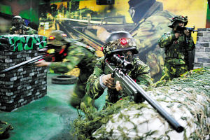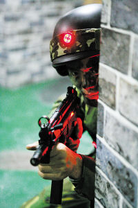 頭頂上機(jī)群盤(pán)旋俯沖,身邊槍聲、爆炸聲此起彼伏,一場(chǎng)激烈的對(duì)抗正在一個(gè)特殊的“戰(zhàn)場(chǎng)”進(jìn)行。1月8日上午,記者在濟(jì)南軍區(qū)某團(tuán)真人CS對(duì)抗陣地看到:“戰(zhàn)場(chǎng)”上矮墻林立、沙包堆積、枯樹(shù)橫亙……戰(zhàn)士們身著作訓(xùn)服,手持仿真槍,頭戴裝有感應(yīng)器的頭盔,在時(shí)明時(shí)暗的“夜空”下穿梭,尋找目標(biāo),激烈對(duì)抗。據(jù)有關(guān)負(fù)責(zé)人介紹,實(shí)施真人CS對(duì)抗練兵在我軍部隊(duì)還是首家。(CS是Counter-strike的縮寫(xiě),中文意為反恐精英。)