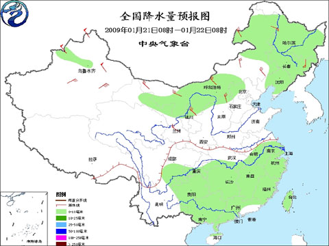 中央氣象臺2009年1月21日6時發(fā)布未來三天天氣預(yù)報: