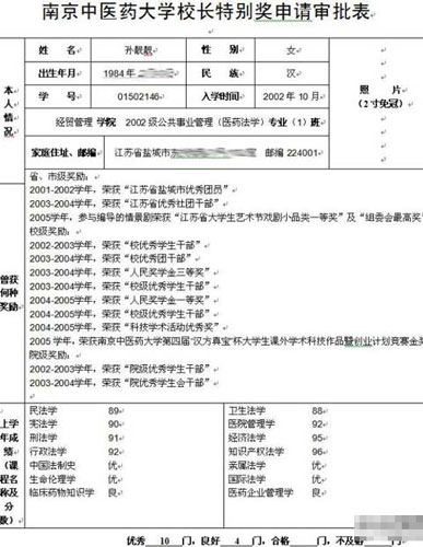 通過網(wǎng)上一份“南京中醫(yī)藥大學(xué)校長(zhǎng)特別獎(jiǎng)申請(qǐng)審批表”里可以看出,孫靚靚是一個(gè)各方面都很出色的學(xué)生。她從2002年起每個(gè)學(xué)年都是校級(jí)或院級(jí)的優(yōu)秀學(xué)生干部。大學(xué)期間品德方面、學(xué)習(xí)方面、實(shí)踐方面等方面的都很優(yōu)秀。依據(jù)這份申請(qǐng)表,孫靚靚是個(gè)積極參與社會(huì)活動(dòng),同時(shí)也是個(gè)學(xué)習(xí)、生活等都很踏實(shí)的人,因此時(shí)常拿到獎(jiǎng)學(xué)金,還參與編導(dǎo)及演出的該校首部校園DV電影《那一年的青澀》很受好評(píng)。