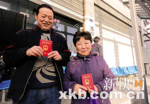 昨天早上10時(shí),陽光明媚,重新拿到結(jié)婚證的譚興茂夫婦走出了辦證大廳。“我們以前的結(jié)婚證是張獎狀,好像是國家對我們愛情的表揚(yáng)!弊T興茂拿著小紅本本對記者說。不過對于新版的結(jié)婚證,譚興茂的妻子趙樹清很興奮,她非常幽默地說:“60多歲了,就當(dāng)又結(jié)了一次婚,可惜老頭子還是那個人……”即使如此,譚興茂還是打算回去再擺一次酒!凹词褂衼砩,我還是會娶她的!弊T興茂說。