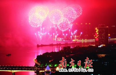 為了讓更多市民能到現(xiàn)場近距離觀賞焰火表演,廣州今年首次設(shè)置兩個燃放點(diǎn)。白鵝潭江面和琶洲展館對出江面兩個燃放點(diǎn)燃放內(nèi)容一致,燃放時間都是30分鐘。據(jù)統(tǒng)計,昨晚共有近40萬市民到兩個燃放點(diǎn)現(xiàn)場觀看。