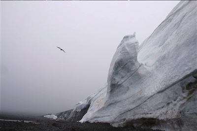 抵達(dá)柯林斯冰帽后,南極科考專家劉小漢稱,從冰緣沉積物的裸露可看出冰帽邊緣在退縮。冰帽表面已出現(xiàn)許多天藍(lán)色的融水潭,大量的水沿著冰面流向大海。不過,當(dāng)天因?yàn)殪F大,不能看清全部冰緣消減的情況。