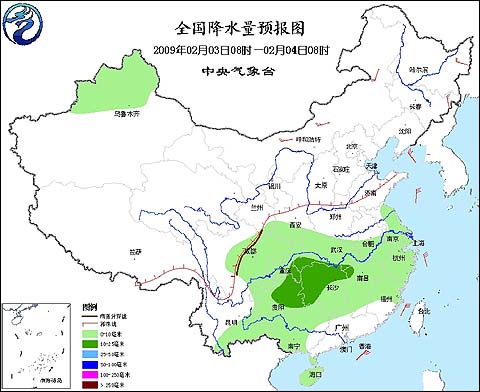 中央氣象臺2009年2月3日06時發(fā)布未來三天天氣預報: