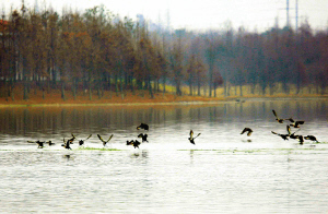 海灣國(guó)家森林公園位于奉賢區(qū)五四農(nóng)場(chǎng)境內(nèi),目前一期工程已完成90%,建成后將是上海規(guī)模最大的森林公園,預(yù)計(jì)年內(nèi)可試開(kāi)放。公園擁有大面積接近自然生態(tài)的森林和上海最大的人工湖泊——百鳥(niǎo)湖。園內(nèi)種植了350多種400多萬(wàn)棵樹(shù)木。圖為上午百鳥(niǎo)湖上野鴨飛舞 本報(bào)記者 紀(jì)海鷹 通訊員 周沅生 攝影報(bào)道