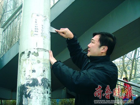 上午9時(shí),在兒童醫(yī)院東側(cè)路段,槐蔭區(qū)區(qū)長楊峰,手里拿著一個(gè)噴壺和一把小鏟子,清理野廣告?吹揭患译娦艩I業(yè)廳前的電線桿上貼滿野廣告,他過去先是用噴壺噴水,把紙弄濕,然后再用小鏟子快速鏟除。由于桿子上端也有臟兮兮的廣告,他踩上旁邊的一個(gè)鐵柵欄,伸長手臂,費(fèi)力鏟凈。不多會(huì),桿子上的野廣告就消失殆盡,接下來,他又用抹布把桿子擦干凈。