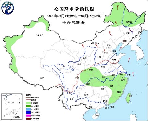 中央氣象臺2009年2月14日06時發(fā)布未來三天天氣預(yù)報: