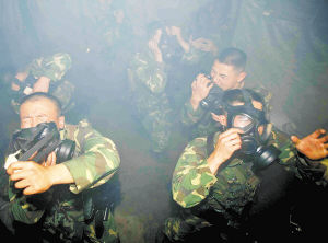 王團長告訴筆者,過去考核,毒氣常常是用煙霧來代替,有時“染毒地域”也不過是露天環(huán)境中用白灰在地上畫的一個“框”,官兵只需戴防毒面具快速通過就行。這次,他們改變了考核方式,將“染毒地域”設置在一個帳篷里,用催淚瓦斯替代了毒氣。同時規(guī)定,必須戴著防毒面具在里面呆5分鐘。王團長笑著說:“這回,誰實戰(zhàn)意識淡化,誰中招!