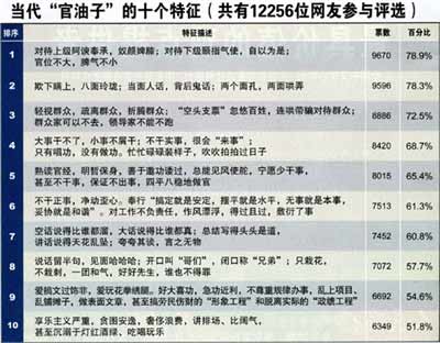 第三個階段:網(wǎng)絡(luò)調(diào)查。自2009年2月1日—2月12日,“官油子具備哪些特征”的專題調(diào)查(分為18條“官油子”特征評選和公眾對“官油子”的態(tài)度調(diào)查兩個部分)在人民網(wǎng)、新浪網(wǎng)、騰訊網(wǎng)、人民論壇網(wǎng)等網(wǎng)絡(luò)上推出。為什么選擇這幾家網(wǎng)站?因各網(wǎng)站的主要受眾群體不同,如人民網(wǎng)主要面向黨政干部,新浪網(wǎng)、騰訊網(wǎng)等為商業(yè)性網(wǎng)站,受眾面更廣,如此能夠體現(xiàn)更加廣泛地參與性,以使調(diào)查更具代表性。網(wǎng)絡(luò)調(diào)查推出短短十幾天的時間,即受到了廣大網(wǎng)友的熱情參與,共有12256人參與。在廣大網(wǎng)友的共同參與下,我們按照得票數(shù)的多少,列出了“官油子”的十種特征。