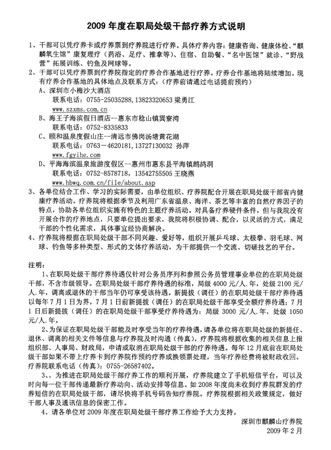 深圳市麒麟山療養(yǎng)院作為全市干部的體檢療養(yǎng)保健基地,負責(zé)承辦在職局處級干部的療養(yǎng)。這則由深圳市麒麟山療養(yǎng)院發(fā)給深圳“各單位”的公告被深圳市建設(shè)局貼到了該局的官方網(wǎng)站上。公告顯示,深圳“各單位”在職局處級干部可以憑療養(yǎng)卡或療養(yǎng)票到療養(yǎng)院進行療養(yǎng),具體療養(yǎng)內(nèi)容包括:健康咨詢、健康體驗康復(fù)理療(藥浴、足療、推拿)、“野戰(zhàn)營”拓展訓(xùn)練、釣魚及網(wǎng)球等。干部還可以憑療養(yǎng)票到療養(yǎng)院指定的療養(yǎng)合作基地進行療養(yǎng),現(xiàn)有的療養(yǎng)基地包括深圳市麒麟山療養(yǎng)院、深圳市小梅沙大酒店、清遠市的頤和溫泉度假山莊、惠州市的平海海濱溫泉旅游度假區(qū)、惠東市的海王子海濱假日酒店。