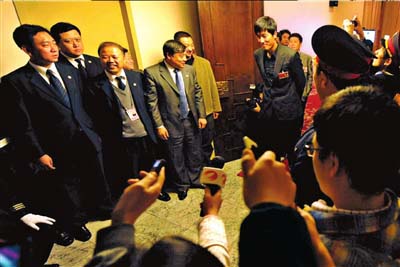小組討論還未開始,21世紀(jì)飯店三樓第七會(huì)議室門口已擠了上百名記者。由于會(huì)議室太小、記者太多,大家都不能進(jìn)去旁聽。攝影和攝像記者10人一組,3分鐘一輪,進(jìn)場(chǎng)拍攝;而文字記者則只能將錄音筆送進(jìn)會(huì)場(chǎng)。會(huì)議室里一下子放了30多個(gè)錄音筆。