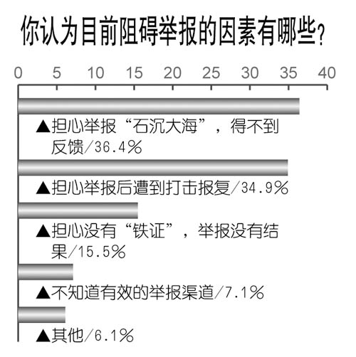 調(diào)查中,公眾給出的阻礙舉報(bào)的因素排序依次為:擔(dān)心舉報(bào)“石沉大!保貌坏椒答(36.4%);擔(dān)心舉報(bào)后遭到打擊報(bào)復(fù)(34.9%);擔(dān)心沒有“鐵證”,舉報(bào)沒有結(jié)果(15.5%);不知道有效的舉報(bào)渠道(7.1%)。
