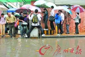 見聞:路兩邊的水很深,至少有1米寬的路面都浸在10厘米深的水里。站在華景路口的行人天橋上,中山大道從東往西方向全是一動(dòng)不動(dòng)的大車小車,從西往東則一輛也沒(méi)有。心里涼了半截,車肯定都堵在崗頂“大水坑”了。