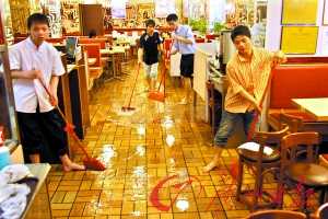 短時(shí)間的強(qiáng)降雨導(dǎo)致沙河金馬服裝城一樓檔主遭殃,數(shù)十家檔口被淹。檔主李小姐說(shuō):“衣服全部濕了,損失幾萬(wàn)元呢!弊尷钚〗悴粷M的是,平常一樓鋪?zhàn)饩秃苜F,每個(gè)月至少5000元,但水浸后,管理人員卻沒(méi)有馬上處理。