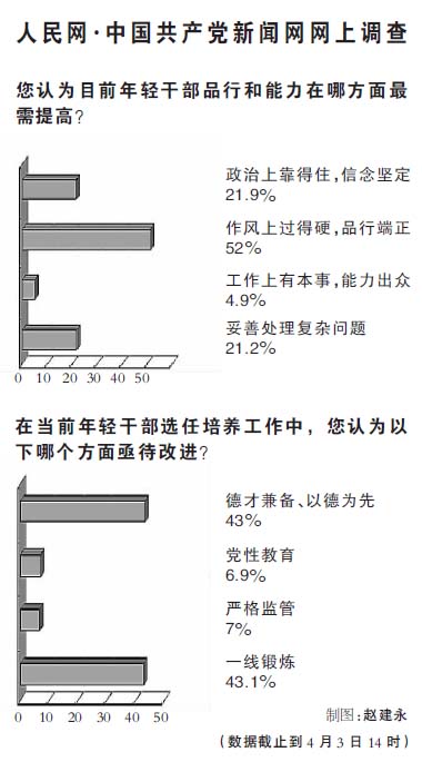截至4月3日,人民網(wǎng)·中國(guó)共產(chǎn)黨新聞網(wǎng)推出的一項(xiàng)針對(duì)年輕干部的網(wǎng)上調(diào)查顯示:93.6%(1853票)的網(wǎng)友認(rèn)為“目前大多數(shù)年輕干部工作經(jīng)歷偏單一”; 43.1%(1095票)的網(wǎng)友認(rèn)為應(yīng)“樹(shù)立注重基層導(dǎo)向,堅(jiān)持多崗位、在基層一線的實(shí)踐中培訓(xùn)鍛煉年輕干部”。