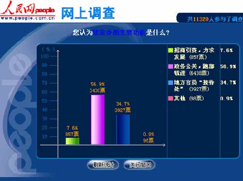截止4月20日21點,《您認為駐京辦主要問題是什么?》共有36079人參與了調(diào)查;在此項調(diào)查中,選項“奢華無度 滋生腐敗”得票最高,為24025票;調(diào)查《您認為駐京辦該不該撤銷?》,近九成網(wǎng)友投票認為“駐京辦”應該撤銷;在調(diào)查《您認為駐京辦的主要功能是什么? 》中,有51%的網(wǎng)友認為駐京辦的主要功能就是政務公關(guān),"跑部錢進"。