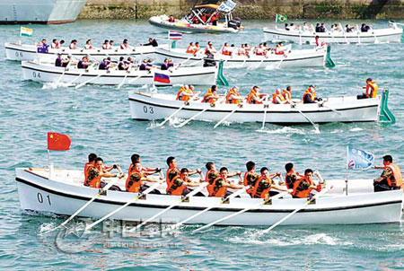 比賽在蔚藍(lán)的海上舉行,116艦的官兵們身著白色的海軍服列隊(duì)站在軍艦上觀看比賽。第一組共七支代表隊(duì)的隊(duì)員們奮力劃槳,白色的舢板逐漸劃向遠(yuǎn)處,宛如7只白色的海鷗貼著海面飛翔。站在記者身邊的印度“孟買”號(hào)軍艦的一位機(jī)電業(yè)務(wù)長(zhǎng)說:“舢板比賽是一種最能體現(xiàn)合作精神的競(jìng)技項(xiàng)目,大家齊心協(xié)力才能劃得快。今天的比賽是一個(gè)很好的紐帶,世界的海軍官兵們可以通過它建立友誼!”