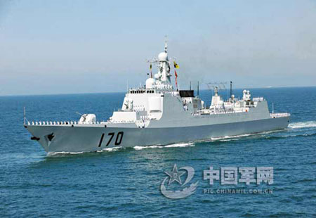 參加海上閱兵的新一代國產(chǎn)驅(qū)逐艦中,“蘭州”號導彈驅(qū)逐艦備受世人矚目。該艦舷號170,是中國目前最新型的導彈驅(qū)逐艦,在網(wǎng)上被譽為“中華神盾”。該艦2001年8月在上海江南造船廠開工建造,2003年4月下水,2005年8月出廠,2005年9月正式命名加入人民海軍序列。
