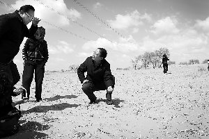 郭虎帶著氣象臺(tái)的年輕預(yù)報(bào)員,進(jìn)入一處沙地。當(dāng)時(shí)風(fēng)很大,吹得大家睜不開眼睛,“瞬間風(fēng)力能達(dá)到五六級(jí)!辈贿^(guò),沒(méi)有沙塵。郭虎蹲下去,用手抓起一把沙子,一松手,沙子被吹出不遠(yuǎn)就飄落了!斑@說(shuō)明沙子里的水分很多!惫⒂檬峙倨鹕匙觼(lái),深不到1厘米的表層下,沙子都是濕的。