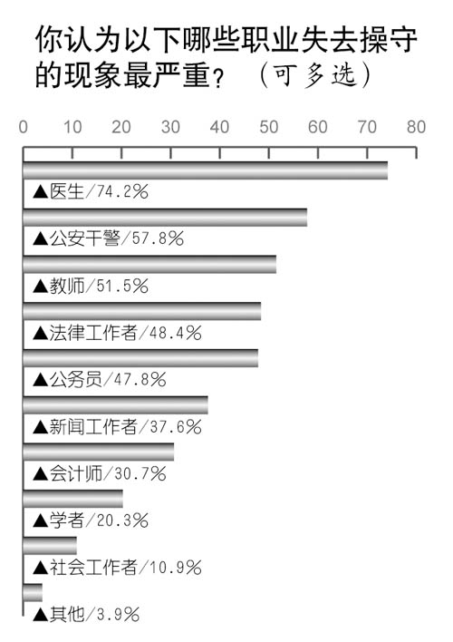 哪些職業(yè)失去操守的現(xiàn)象最嚴重?調(diào)查中公眾給出的排序依次為:醫(yī)生(74.2%)、公安干警(57.8%)、教師(51.5%)、法律工作者(48.4%)、公務(wù)員(47.8%)、新聞工作者(37.6%)、會計師(30.7%)、學者(20.3%)、社會工作者(10.9%)。