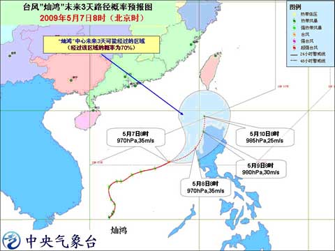 中新網(wǎng)5月7日電 中央氣象臺2009年5月7日10時發(fā)布熱帶氣旋公報:今年第2號強(qiáng)熱帶風(fēng)暴“燦鴻”于今天上午加強(qiáng)為臺風(fēng),上午8時其中心位于東沙群島以南大約590公里的南海中部海面上,就是北緯15.3度,東經(jīng)117.3度,中心附近最大風(fēng)力有12級(35米/秒)。