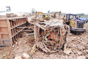 廠區(qū)四周的圍墻已經多處出現了爆破后的破損,廠子的西圍墻部位,被掀翻后的辦公樓的混凝土砸出了近20米的缺口,破損的石塊下,不時還可以看到被撕破的衣服和鞋子等物。工廠大門口,一輛轎車被沖擊波完全擊碎,連什么品牌都無法辨認。