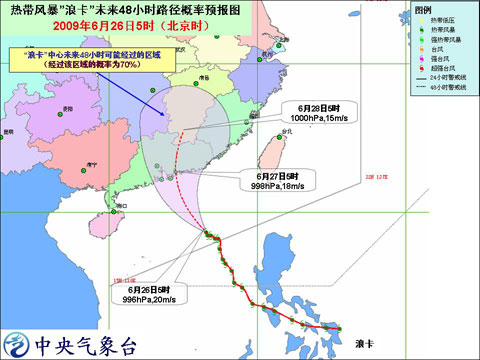 受“浪卡”和西南季風的共同影響,今天白天到夜間,南海北部海面、廣東沿海將有7-8級大風,風暴中心經(jīng)過的部分海域或地區(qū)的陣風可達9-10級,南海中部將有6-7級大風;廣東東部、福建南部將有大到暴雨,廣東沿海的部分地區(qū)有大暴雨。